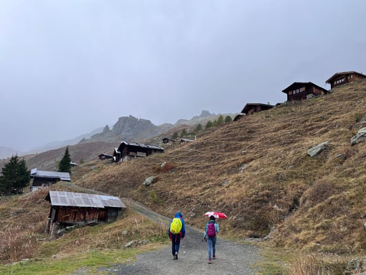 Am letzten Tag der Herbstferien und ausserdem am Tag mit der schlechtesten Wetterprognose machten sich 8 Frauen auf, neue Ecken der Schweiz zu entdecken. Nach einer gemütlichen Zug- und Busfahrt, angereichert mit leckeren "Gipfeli", erreichten wir unseren Startpunkt, die Fafleralp. Von dort aus wanderten wir vor malerischer, mythischer und zunehmend nasser Kulisse auf die Lauchernalp.